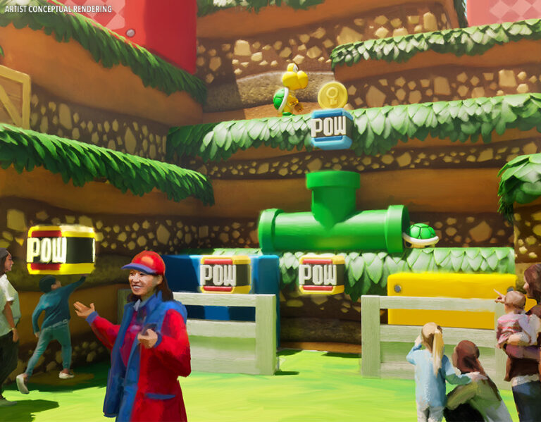 - Super Nintendo World – Step into the pixel-perfect landscapes of the Mushroom Kingdom! Speed through the high-stakes twists of Mario Kart: Bowser’s Challenge, punch ‘?’ blocks for power-ups, and face off against Bowser Jr. in an interactive showdown. Plus, don’t miss the all-new Donkey Kong Country, where adventure awaits beyond the jungle!
