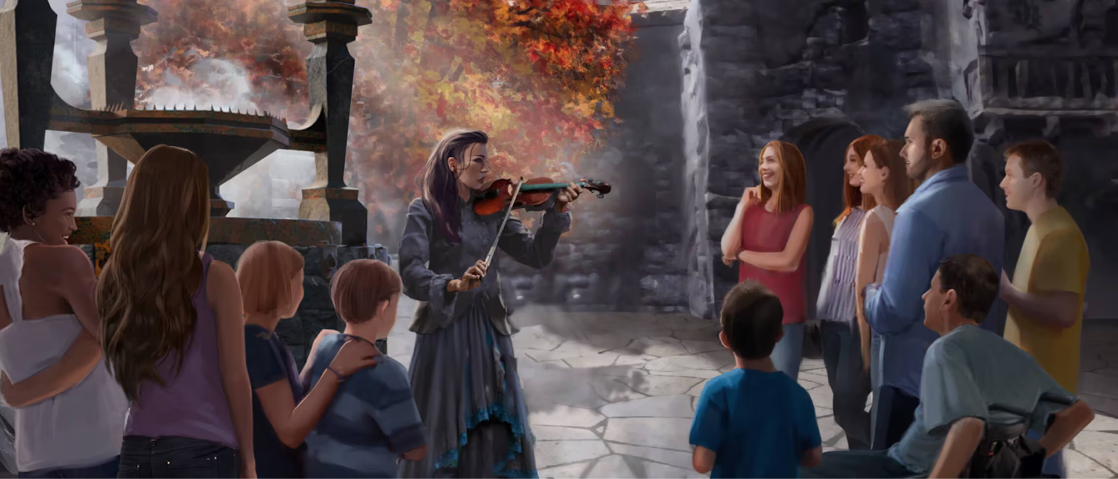 While exploring the streets of Place Cachée, guests will also encounter other visitors, officials, and residents from the wizarding world, including exchange students from the Hogwarts and Ilvermorny Schools of Witchcraft and Wizardry, an Auror from the Ministère des Affaires Magiques de la France who roams inquiring of suspicious characters, talking portraits of delightful wizards who engage with locals about the happenings in Place Cachée, and more.
